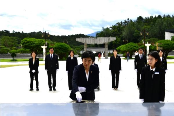 신수정 의장을 비롯한 9대 의회 후반기 의장단 및 상임위원장단은 22일 광주독립운동기념탑을 시작으로 광주학생독립운동기념탑, 현충탑, 4·19의거 희생 영령추모비, 국립 5·18민주묘지를 차례로 방문해 합동 참배했다.