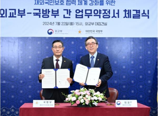 [중앙뉴스라인, 신기철기자] 외교부와 국방부는 7월 22일 오후 외교부 청사에서 '재외국민 보호 협력체계 강화를 위한 외교부·국방부 간 업무약정' 체결식을 개최했다.