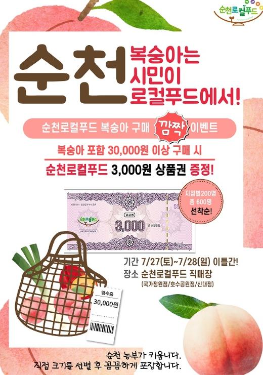 순천로컬푸드(주)는 오는 27일과 28일 이틀간 순천만국가정원점, 조례호수공원점, 신대점 등 3개 로컬푸드 직매장에서 순천 복숭아 농가를 지원하기 위한 '복숭아 구매 깜짝 이벤트'를 진행한다고 밝혔다.