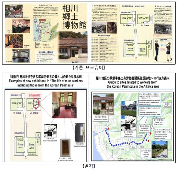 일본 정부가 설치한 자료는 사도광산 인근 ‘아이카와 향토박물관’ (영문명 Aikawa History Museum)에 당시 한국인 노동자들이 어떤 과정으로 오게 됐고, 노동자 규모가 어느 정도이며, 이들의 생활과 노동 환경이 얼마나 가혹했는지를 보여주는 역사 자료들이며, 현재는 공터로 남아 있으나 한국인 노동자들이 생활했던 기숙사 등 직접적으로 관련된 장소에는 안내판이 설치되고, 안내자료 등을 통해서도 해당 장소가 소개될 예정이다.