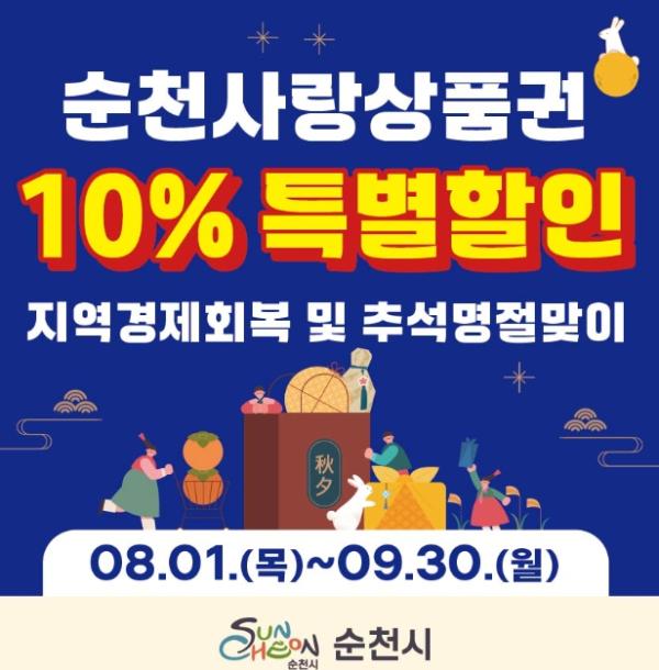 [중앙뉴스라인, 전은희기자] 순천시는 오는 8월 1일부터 9월 30일까지 순천사랑상품권 10% 특별할인판매를 실시한다고 밝혔다.