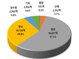 어업 종류별로는 연안어선이 36,657척, 57.1%로 가장 많았고, 어선 규모별로는 5톤 미만 어선이 50,912척으로 79.3%를 차지했다. 어선 재질별로는 섬유강화플라스틱(FRP)으로 만들어진 어선이 62,220척, 96.9%로 대부분을 차지하고 있다.