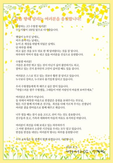 이정선 교육감은 수능 D-100일을 맞은 6일 전체 고등학교에 서한문을 보내 고3 수험생을 격려하고, 직접 학교를 찾아 수험생을 응원한다.
