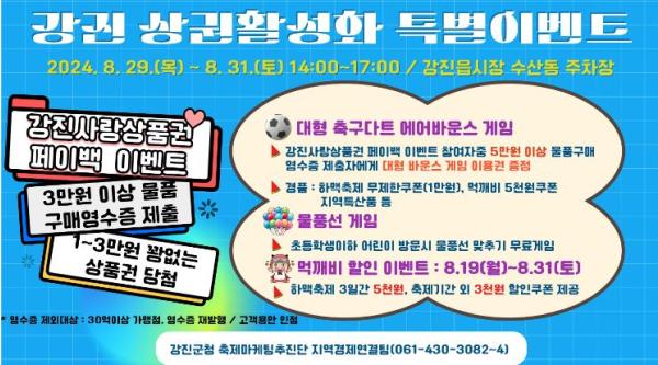 주요 이벤트로는 먹깨비 할인 이벤트, 강진읍 상권활성화 상품권 페이백 이벤트, 대형 축구다트 에어바운스 게임, SNS 내돈내산 특별 이벤트 등이 있다.