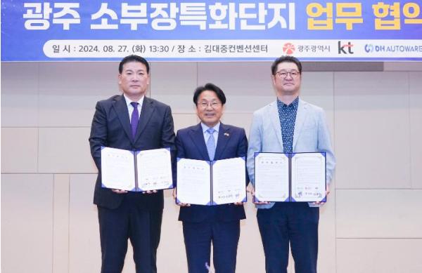 [중앙뉴스라인, 손기주기자] 광주광역시는 27일 김대중컨벤션센터에서 광주 자율주행차 소부장(소재?부품?장비) 특화단지 성공 추진을 위해 선도기업인 ㈜DH오토웨어, KT와 업무협약을 체결했다.