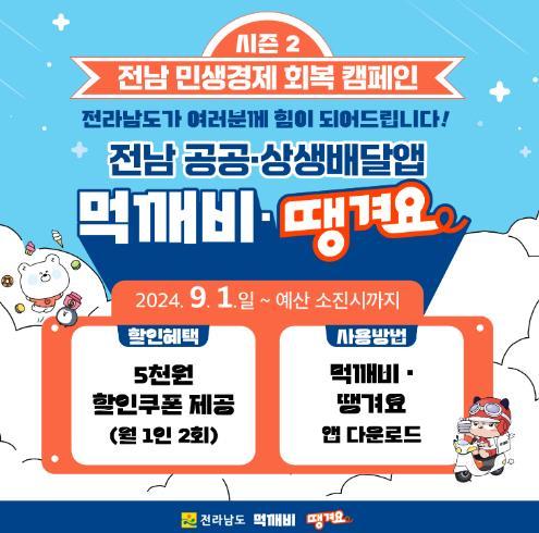 [중앙뉴스라인, 전은희기자] 전라남도에서 소상공인의 중개수수료 부담 완화와 지역경제 활성화를 위해 운영 중인 공공?상생 배달앱 ‘먹깨비’와 ‘땡겨요’를 통해서 9월 1일 일요일부터 ‘전남 민생경제 회복 캠페인’ 5천 원 할인 쿠폰을 제공한다.