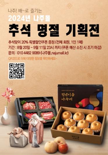 나주시는 농특산물 공식 온라인 쇼핑몰인 ‘나주몰’에서 추석명절 할인 기획전을 오는 9월 11일까지 진행한다고 28일 밝혔다.