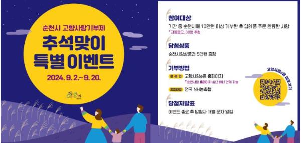 [중앙뉴스라인, 전은희기자] 순천시가 추석을 맞아 오는 9월 2일부터 20일까지“순천 고향사랑기부제 추석맞이 특별 이벤트”를 진행한다.
