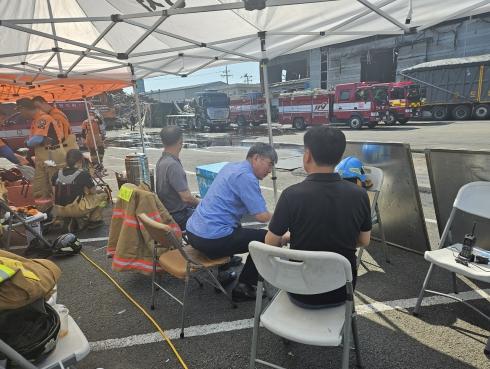 최명수 위원장은 현장에 설치된 지휘본부를 찾아 이틀째 이어지고 있는 화재현장에 대한 현황을 청취하고 대원들을 격려했다.