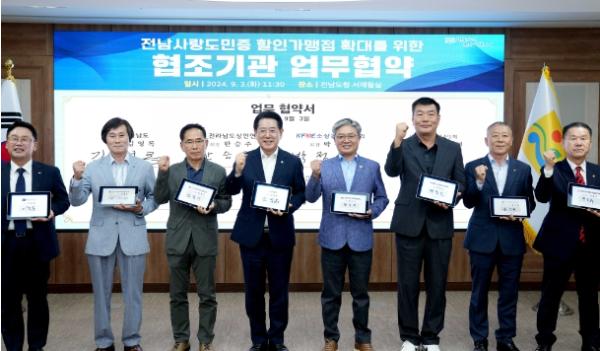 전남도와 7개 단체는 전남사랑도민증 할인가맹점 확대와 고향사랑 실천, 할인가맹점 홍보와 이용 활성화를 위한 행·재정적 지원 등에 협력, 인구소멸 위기를 극복하고 지역경제가 활성화되도록 힘을 모으기로 했다.