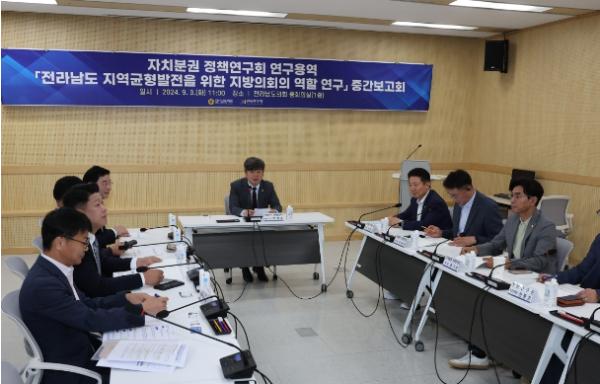 [중앙뉴스라인, 김민수기자] 전라남도의회 의원 연구단체인 ‘자치분권 정책연구회(대표의원 박원종)’가 지난 9월 3일 전라남도의회 중회의실에서 ‘전라남도 지역균형발전을 위한 지방의회의 역할’ 연구용역 중간보고회를 개최했다.