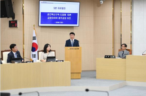 [중앙뉴스라인, 손기주기자] 정재봉 광산구의원(더불어민주당, 송정1·2동·도산동·어룡동·동곡동·평동·삼도동·본량동)이 4일 제291회 광산구의회 임시회 제1차 본회의에서 ‘공간혁신구역’을 활용한 금호타이어 이전을 제언하는 5분 자유발언에 나섰다.