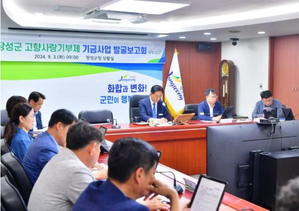 군은 3일 군청 상황실에서 김한종 장성군수 주재로 전 부서 실과소장이 참석한 가운데 ‘고향사랑기부제 기금사업 발굴보고회’를 가졌다.