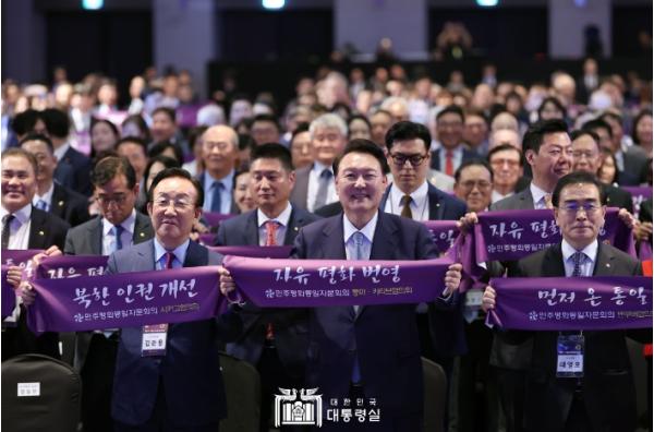 오늘 민주평통 해외지역회의는 ‘자유 평화 번영의 통일 대한민국’이라는 주제로 ?8.15 통일 독트린?에 대한 해외지역 자문위원들의 이해를 제고하고, 국제사회의 지지를 확산하기 위해 개최됐다. 대통령은 취임 이래 매년 민주평통 회의에 참석하고 있으며, 2022년 해외지역회의와 2023년 전체회의에 이어 이번이 세 번째이다.