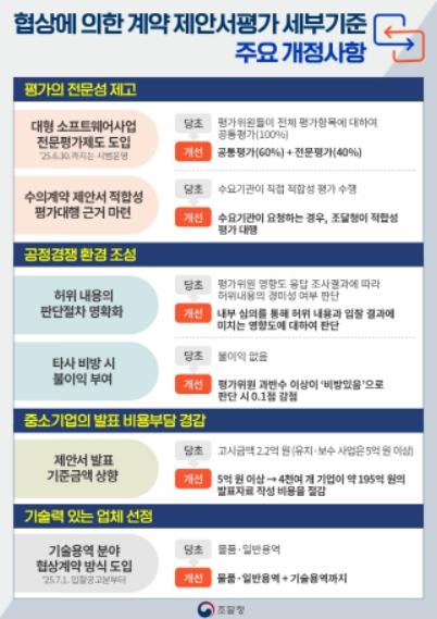 개정된 제안서 평가 세분 기준은 중소기업의 과도한 제안서 발표 비용 부담을 경감하고, 기술용역에 협상계약을 적용하는 것이 핵심이다.