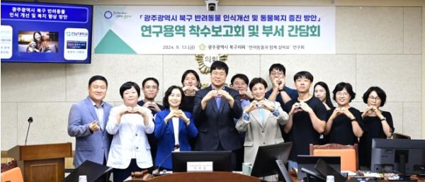 [중앙뉴스라인, 손기주기자] 광주 북구의회 ‘반려동물과 함께 살아요’ 연구회가 지난 13일 '반려동물 인식 개선 및 복지 향상 방안 연구용역' 착수보고회를 개최했다고 밝혔다.
