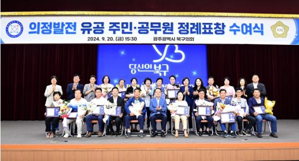 [중앙뉴스라인, 손기주기자] 광주 북구의회는 지난 20일, 2024년도 3분기 정례표창 수여식을 개최하여 의정발전, 사회봉사, 주민자치 3개 분야에 공이 있는 주민과 공무원에게 표창패를 수여했다고 밝혔다.