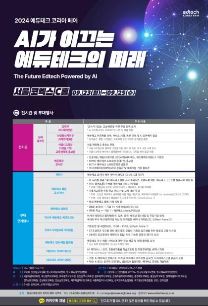 이번 행사는 국내외 300개 기업·기관의 다양한 에듀테크 제품·서비스 전시관을 중심으로 수출상담회, 생성형 AI 활용 대전 등 다채로운 프로그램이 진행된다. 특히, 전시관에서는 AI 기술, AI 학습 콘텐츠, XR·VR 등 메타버스 시뮬레이터, 첨단교육 디바이스 등 에듀테크 기술을 체험할 수 있다.