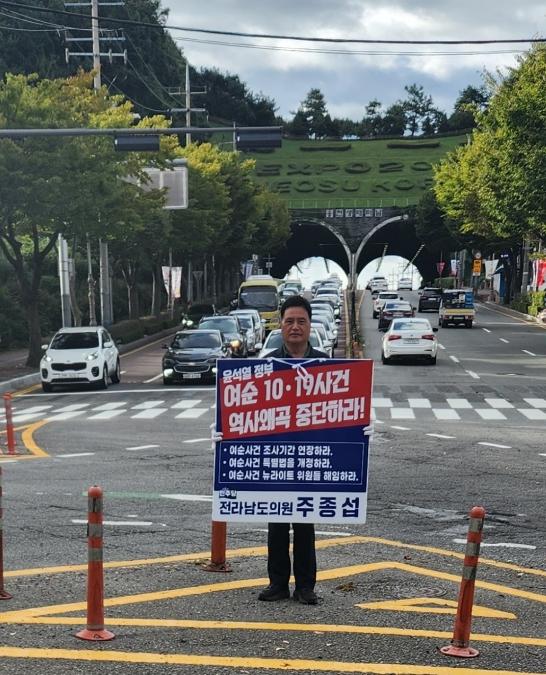 [중앙뉴스라인, 김민수기자] 전라남도의회 주종섭 의원(더불어민주당, 여수6)은 지난 9월 23일 윤석열 정부의 여순 10·19사건 역사왜곡 중단을 촉구하는 1인 시위를 진행하고, 여순사건 희생자 유족회 등 33개 시민단체가 참가한 여순사건 성명 발표에 참여했다.