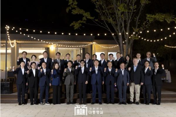 [중앙뉴스라인, 우제헌기자] 윤석열 대통령은 9월 24일 저녁 국민의힘 지도부를 대통령실 앞 분수정원으로 초청해 야외에서 만찬을 가졌다. 대통령실과 국민의힘 지도부 만찬은 지난 7월 23일 전당대회 이후 새롭게 구성이 완료된 당 지도부를 처음으로 초청해 상견례와 함께 당 지도부를 격려하고 화합을 다지는 만찬이다.