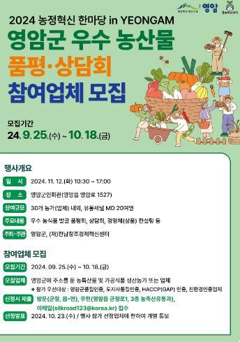 영암군 농수축산·식품 생산 농가, 가공식품업체가 행사에 참가할 수 있고, 접수는 읍·면 행정복지센터나 영암군 농축산유통과에서 방문·우편·이메일로 받는다. 참가자 선정 결과는 23일에 개별 통지한다.