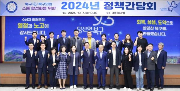 이날 정책간담회는 북구 발전과 비전을 공유하고 지역 현안 과제와 주요사업의 원활한 추진을 위해 마련됐으며 최무송 의장을 비롯한 12명의 북구의원과 문인 구청장을 비롯한 간부 공무원들이 참석했다.
