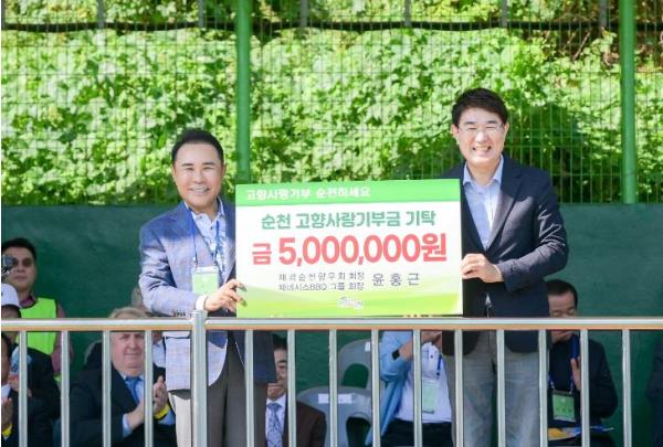 [중앙뉴스라인, 전은희기자] 순천시는 지난 9일 서울 관악구민운동장에서 열린 (사)재경순천애향회 행사에서 재경순천향우회 윤홍근 회장(제너시스BBQ 회장)과 고향사랑기부금 500만원 기탁식을 가졌다.
