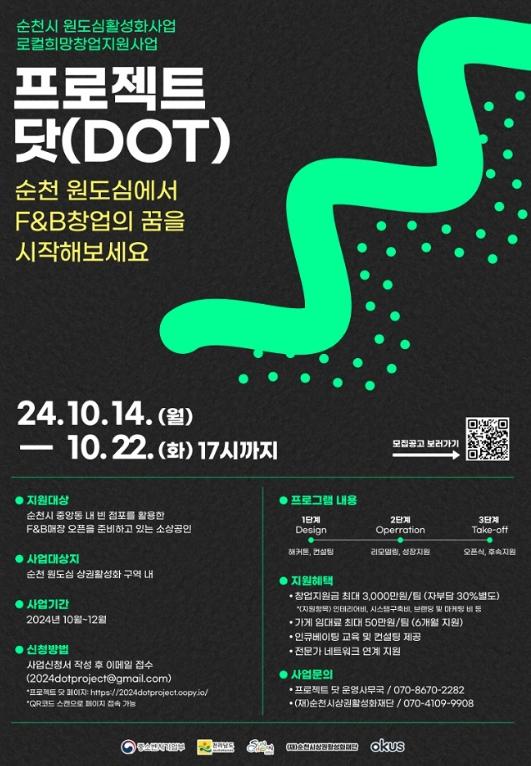 [중앙뉴스라인, 전은희기자] 순천시는 오는 22일까지 원도심 로컬 희망 창업 지원사업인 ‘프로젝트 닷(DOT)’에 참여할 외식업 창업가(팀)를 모집한다.