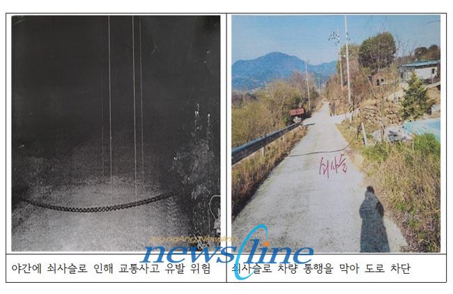 | <2011년 쇠사슬을 설치해 차량통제 후 교행시 위험해 2022년 4월 농어촌공사에서 철거> |