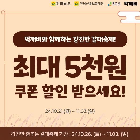 축제가 시작되는 10월 26일 토요일을 포함한 주말 4일간은 기존에 추진 중인 ‘강진군 주말 3천 원 할인 쿠폰’과 중복 사용이 가능한 2천 원 할인 쿠폰이 매일 선착순 400명에게 제공되어, 축제 기간 내내 5천 원의 할인 혜택이 받을 수 있다.