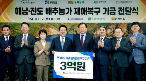 [중앙뉴스라인, 김민수기자] 전라남도는 17일 한국농어촌희망재단으로부터 9월 배추 호우피해 농가 복구를 위한 상생기금 3억 원을 기탁받았다고 밝혔다.