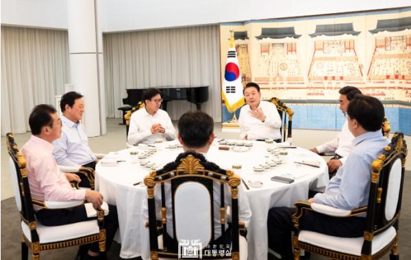 [중앙뉴스라인, 우제헌기자] 10월 18일 윤석열 대통령은 대통령 관저에 박형준 부산광역시장, 김두겸 울산광역시장, 박완수 경상남도지사를 초청해 지역 현안 등을 청취하는 정책간담회를 갖고, 만찬을 진행했다.