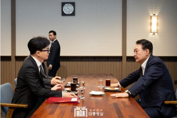 [중앙뉴스라인, 우제헌기자] 10월 21일 윤석열 대통령은 용산 대통령실 파인그라스에서 한동훈 국민의힘 당 대표와 면담을 가졌다.