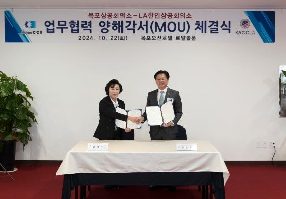 목포상공회의소는 지난 22일 목포오션호텔에서 LA한인상공회의소(회장 정동완)와 상호협력을 통한 기업 비즈니스 활동지원을 도모하기 위해 업무협약을 체결했다.