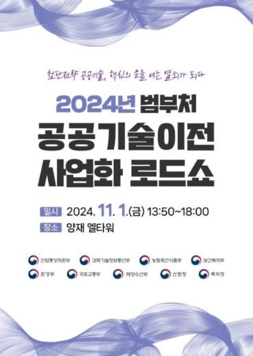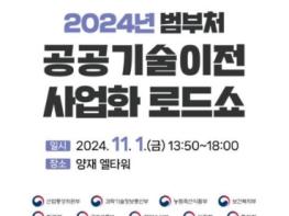 [중앙뉴스라인, 우제헌기자] 특허청은 과학기술정보통신부, 농림축산식품부, 산업통상자원부, 보건복지부, 환경부, 국토교통부, 해양수산부, 산림청과 공동으로 11월 1일 13시 50분, 엘타워(서울시 서초구)에서 우수 공공기술의 민간 이전·사업화 촉진을 위한 ‘2024년 범부처 공공기술 이전·사업화 로드쇼’를 개최한다고 밝혔다.