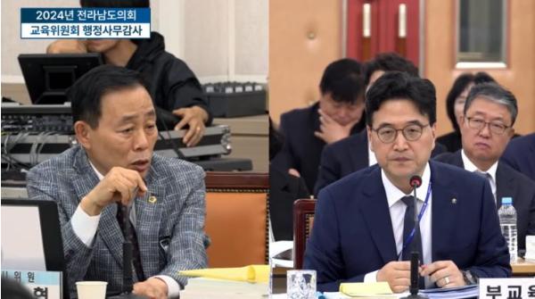 답변에 나선 전라남도교육청 황성환 부교육감은 “학교현장의 상황에 따라 다양한 견해가 있지만, 전남교육의 방향성을 확고히 하도록 노력하겠다”고 답했다.