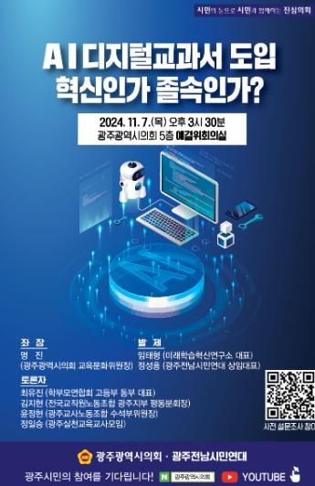 광주시의회는 7일 시의회 예산결산위원회 회의실에서 ‘AI디지털교과서 도입 혁신인가 졸속인가?’ 라는 주제로 정책토론회를 가질 예정이다.