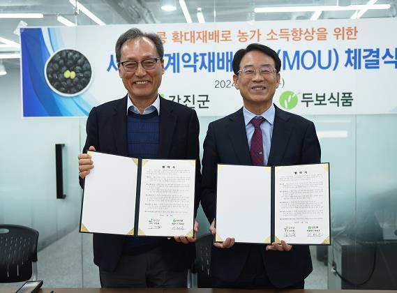 군은 이날 협약으로 고품질 서리태(청자5호) 생산단지(150ha) 조성을 통한 지속적인 원료곡 생산으로 소득화의 기반을 마련할 것으로 기대되며, ㈜두보식품은 종자공급은 물론 강진산 서리태를 이용한 제품개발 및 안정적인 원료곡 수매 등을 지원키로 했다.