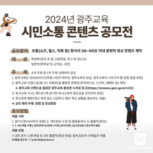 [중앙뉴스라인, 손기주기자] 광주시교육청은 오는 8~26일 교육가족과 시민이 함께하는 ‘2024 광주교육 시민소통 콘텐츠 공모전’을 실시한다.