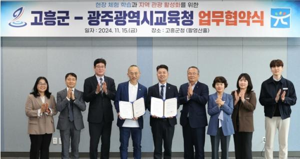 광주시교육청과 고흥군은 지난 15일 고흥군청에서 광주시교육청 최승복 부교육감, 고흥군 조대정 부군수, 광주학생해양수련원 김필모 원장 등이 참석한 가운데 ‘광주 학생 현장체험학습 및 고흥 지역 관광 활성화’를 위한 업무협약을 체결했다.