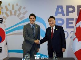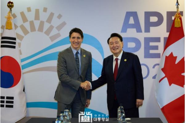 [중앙뉴스라인, 우제헌기자] APEC 정상회의 참석을 위해 페루 리마를 방문 중인 윤석열 대통령은 11월 15일 '저스틴 트뤼도(Justin Trudeau)' 캐나다 총리와 정상회담을 갖고, 양국 안보·방산 협력과 경제 협력을 포함한 실질 협력 증진 방안을 논의하고, 러북 협력 대응 등 지역·글로벌 현안에 대해 의견을 교환했다.