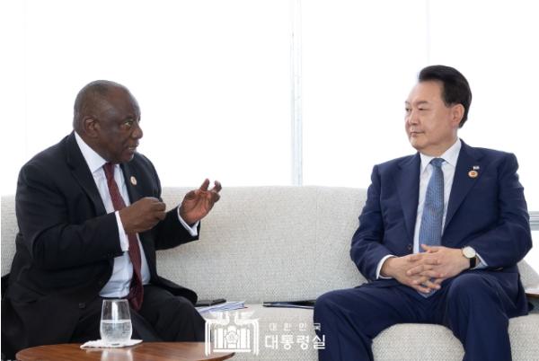 [중앙뉴스라인, 우제헌기자] G20 정상회의 참석을 위해 브라질 리우데자네이루를 방문 중인 윤석열 대통령은 11월 19일 '마타멜라 시릴 라마포사(Matamela Cyril Ramaphosa)' 남아프리카공화국 대통령과 정상회담을 갖고, 양국 간 실질 협력 방안과 지역 및 글로벌 현안에 대해 의견을 교환했다.
