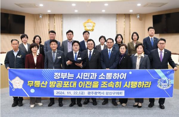 [중앙뉴스라인, 손기주기자] 광산구의회가 22일 무등산 방공포대 이전과 관련하여 정부에 시민과 소통하고 조속 시행할 것을 촉구하는 성명서를 발표했다.