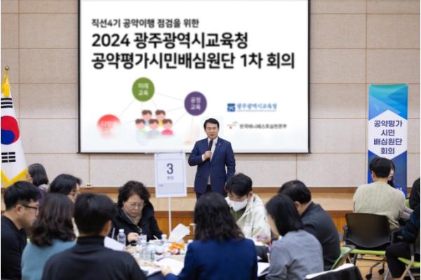 [중앙뉴스라인, 손기주기자] 광주광역시교육청이 26일 직선4기 이정선 교육감 공약이행사항 점검과 의견 수렴을 위해 시민평가배심원단 50명을 위촉하고 1차 회의를 개최했다.