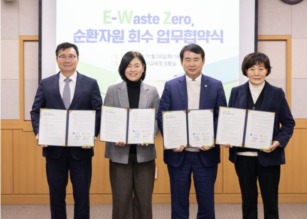 [중앙뉴스라인, 손기주기자] 광주시교육청은 지난 26일 광주광역시의회 환경복지위원회, (사)자원순환사회연대, E-순환거버넌스와 ‘E-Waste Zero, 순환자원 회수 업무협약’을 체결했다.