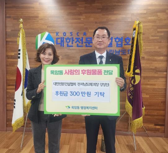 대한전문건설협회(KOSCA) 전라남도회는 지난 27일 취약계층 지원을 위한 후원금 300만원을 목포복지재단을 통해 옥암동 지역사회보장협의체에 기탁했다.