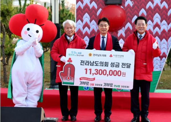 [중앙뉴스라인, 김민수기자] 전라남도의회는 12월 2일, 전남도청 광장에서 열린 '희망 2025 나눔 캠페인' 사랑의 온도탑 제막식을 통해 의원과 직원들의 급여 끝전 모금액 등 1,130만 원의 성금을 전남사회복지공동모금회에 전달했다.