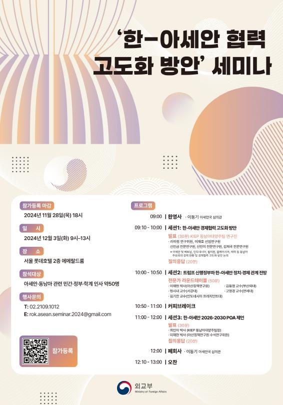 이번 세미나는 아세안 관련 학계 및 연구기관이 함께 한-아세안 관계의 현재를 진단하고, 변화하는 국제 정치·경제 환경 속에서 한-아세안 관계 심화를 위한 전략적 협력 방향을 모색하는 기회가 된 것으로 평가된다.