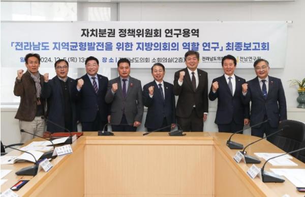 [중앙뉴스라인, 김민수기자] 전라남도의회 ‘자치분권 정책연구회’가 지난 12월 5일 전라남도의회 소회의실에서 ‘전라남도 지역균형발전을 위한 지방의회의 역할 연구’ 정책연구용역 최종보고회를 개최했다.
