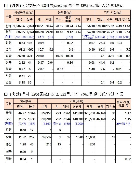 지난 11월 26일부터 28일까지 전국에 내린 눈으로 경기, 강원, 충청, 전북 등 지역에서 시설하우스와 축사 등 농업분야 약 2,015㏊의 피해(잠정, 12.4. 신고기준)가 발생한 것으로 집계됐다. 지역별로는 경기도에서 가장 많은 1,676㏊(시설하우스 약 937㏊, 인삼시설 약 521㏊, 과수 177㏊, 버섯 3㏊, 축사 약 32㏊ 등) 피해가 발생했고, 충청북도에서도 약 165㏊의 피해가 발생했다고 신고했다.